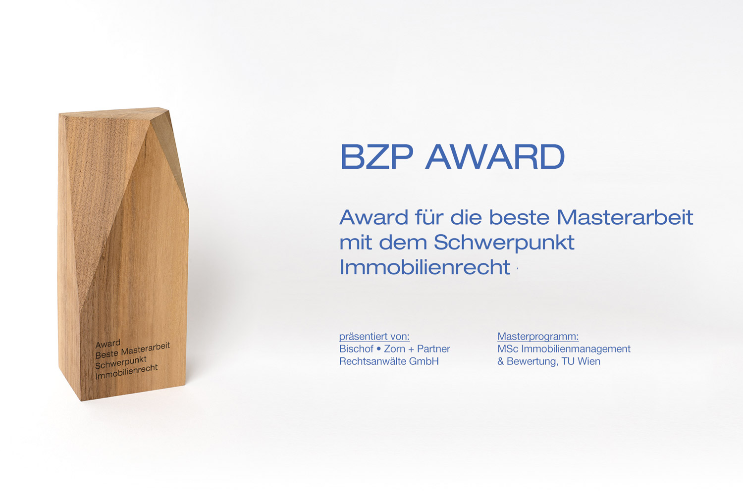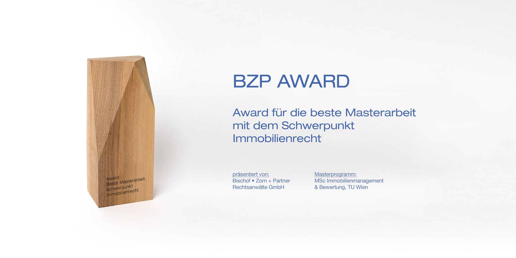 Das theoretische und praktische Wissen und das Netzwerk sind bleibende Werte. Als Absolvent dieses Masterprogramms ist es Mag. Zorn ein besonderes Anliegen gemeinsam mit seiner Kanzlei Bischof · Zorn + Partner Rechtsanwälte GmbH, öffnet eine externe URL in einem neuen Fenster eine Masterthese mit einem juristischen Thema auszuzeichnen. Den dritten BZP Award erhält Frau Andrea Pöchhacker mit der Masterthese „Das WGG & über den Einfluss gemeinnütziger Bauvereinigungen auf die Wiener Stadtentwicklung“.
